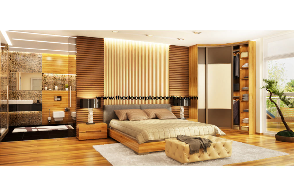 A mirror framed in gold can help open up the space and reflect light, while navy cushions with gold detailing add a sense of richness. Little touches like golden trays, clocks, or artwork can elevate the design, giving your bedroom a polished and thoughtful finish.